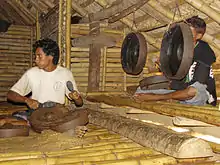 The Sumbanese clan house is largely a timber and bamboo constructions, bamboo being more used on the western side of Sumba Island than on the east.[3] Tree trunks constitute the four principal house posts and other load bearing elements. Only certain hardwoods are reserved for the construction of special ancestral houses (uma marapu). Walls are made from panels of plaited bamboo, or woven coconut leaf. Whole bamboo culms constitute the floor. The roof is made of a dense thatch of alang-alang grass, tied with coconut leaf to battens made from saplings.[1]
