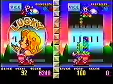 Pressing the B button activates a colored Squall (Sunshine) that will clear all blocks that match it from the playfield but only two Squalls are given to players per credit, however more can be obtained by achieving a "Lucky Bonus" through a flashing X block that appears on random occasions at the center of a X pattern and matching four tiles of the same color.[5][6][7][8] Failing to catch any of the blocks into the dish rises the water at the bottom of the screen by one level, leaving less space to catch the blocks and if said blocks exceeds the amount of available space on the playfield, the game is over as a result unless players insert more credits into the arcade machine to continue playing.[5][6][7][8] The game also offers a two-player mode where players compete for the highest score.[5][6][7]
