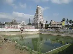 A granite wall surrounds the temple, enclosing all its shrines. The temple has a five-tiered rajagopuram, the gateway tower. The temple tank is located adjacent to the temple, outside the main entrance. Unlike other temples, the temple has three sanctums in a two tiered structure and three shrines in three cardinal directions in the lower level.