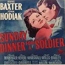 Sunday Dinner for a Soldier is a 1944 American drama romance war film directed by Lloyd Bacon and starring Anne Baxter and John Hodiak. It is based on a novelette by Martha Cheavens.