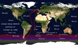 By January, concern was growing for Knox-Johnston. He was having problems with his radio transmitter and nothing had been heard since he had passed south of New Zealand.[49] He was actually making good progress, rounding Cape Horn on 17 January 1969. Elated by this successful climax to his voyage, he briefly considered continuing east, to sail around the Southern Ocean a second time, but soon gave up the idea and turned north for home.[50]