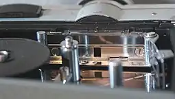 In 1973 Kodak introduced Ektasound—magnetic recording on the actual Super 8 film.[37] The sound track was added on the edge of the film opposite to the perforations. Standard 8mm had the stripe between the perforations and the edge of the film which made good contact with a magnetic head problematic. A balance stripe was added on the opposite edge to facilitate spooling of the film. The Ektasound cartridge was deeper than the silent cartridge to allow access of the camera's recording head. Thus, silent cameras could not accept Ektasound cartridges, but Ektasound cameras and projectors accepted silent cartridges. Projectors, that could record and play sound, appeared before sound cameras. The sound was recorded 18 frames in advance of the picture (as opposed to 56 frames for standard 8mm). This short distance of just 3 inches facilitated the relatively compact size of the later sound cartridges. Some projectors used the balance stripe to provide a second channel for stereo sound.