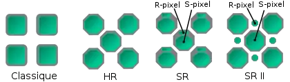 On January 21, 2003 Fujifilm announced the fourth generation of SuperCCD sensors, in two variations: SuperCCD HR and SuperCCD SR.[2][3] HR stands for "high resolution" and SR stands for "super dynamic range". The SR sensor has two photodiodes per photosite, one much larger than the other. Appropriately processing information from both can yield larger black to white range of brightness (dynamic range).