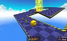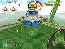Reminiscent of Marble Madness and Labyrinth, the objective of the main game is to guide one of four playable monkeys (AiAi, MeeMee, Baby, and GonGon) encased in a transparent ball across a suspended series of platforms and through a goal.[4][5][7] By moving the analog stick, the player tilts the entire set of platforms that make up a level, called a floor, and the ball rolls accordingly.[4][5][8] If the ball falls off a floor (an event dubbed a fall out) or the in-game timer reaches zero, the player loses one of their three lives.[7] The speed, in miles per hour, at which the ball is moving is displayed in the corner of the screen.[9] Pausing the game and selecting the "View Stage" option allows one to rotate the camera around and examine the floor.[10] A replay is presented after a floor's goal has been reached; replays can be saved to a memory card and viewed at whim.[11] Every second remaining on the timer when a floor is completed adds 100 points to the player's score. Collectible bananas found throughout the game are also worth 100 points, while multipliers increasing the player's score by a factor of two or four are activated when a floor is finished in under half the allotted time or via a warp gate.[4][6] The player receives an extra life for every 100 bananas collected.[12]