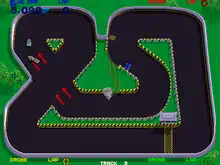 Super Sprint (known as Sprint Master on the Atari 2600)[1] is a racing video game released by Atari Games and Midway Games in 1986. Up to three players drive Formula One-like cars on a circuit that is viewed from above.[2] The game is a successor to Gran Trak 10 and the Sprint series, which were black-and-white games from the 1970s. A sequel, Championship Sprint, was released later in the same year.