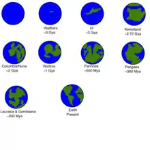 The most recent supercontinent, Pangaea, formed about 300 million years ago (0.3 Ga). There are two different views on the history of earlier supercontinents. The first proposes a series of supercontinents: Vaalbara (c. 3.6 to c. 2.8 billion years ago); Ur (c. 3 billion years ago); Kenorland (c. 2.7 to 2.1 billion years ago); Columbia (c. 1.8 to 1.5 billion years ago); Rodinia (c. 1.25 billion to 750 million years ago); and Pannotia (c. 600 million years ago), whose dispersal produced the fragments that ultimately collided to form Pangaea.[1][2]