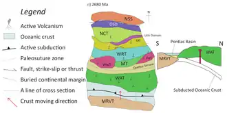 The northward direction of the subduction is evident due to the ceased arc magmatism in Winnipeg River superterrane at about 2695 Ma. Apart from the ceased magmatism, the sanukitoid plutons formed in the area during 2695-2685 Ma (which inferred the breakoff of a subduction slab) also indicated the subduction towards the north. After the subduction, the two terranes were sutured under the Quetico belt. This also trapped the clastic sediments fluxing into the belt, marking its transition from an accretionary wedge to a foreland basin.[71] At the northern Wawa-Abitibi terrane, researchers identified two events of deformation occurred during the orogeny. The first one (D1 deformation event) is the intra-arc deformation accompanied by calc-alkaline magmatism during 2695 Ma. The second one (D2 deformation event) is the transpressive deformation at the margin between the Wawa-Abitibi Terrane and the Wabigoon terranes during 2685-2680 Ma.[71]