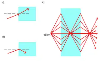Normally, when a wave passes through the interface of two materials, the wave appears on the opposite side of the normal. However, if the interface is between a material with a positive index of refraction and another material with a negative index of refraction, the wave will appear on the same side of the normal. Pendry's idea of a perfect lens is a flat material where n=−1. Such a lens allows near-field rays, which normally decay due to the diffraction limit, to focus once within the lens and once outside the lens, allowing subwavelength imaging.[25]