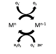 2), a reactive oxygen species, into hydrogen peroxide, which is further converted into water by catalase.[2] Reactive oxygen species are natural byproducts of cellular respiration and cause oxidative stress and cell damage, which has been linked to causing cancers, neurodegeneration, age-related declines in health, and inflammatory diseases.[3][4] SOD mimetics are a prime interest in therapeutic treatment of oxidative stress because of their smaller size, longer half-life, and similarity in function to the native enzyme.[3][5][6]