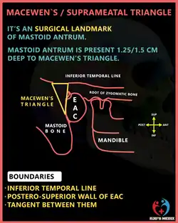 In the temporal bone, between the posterior wall of the external acoustic meatus and the posterior root of the zygomatic process is the area called the suprameatal triangle, suprameatal pit, mastoid fossa, foveola suprameatica, or Mc Ewan's triangle, through which an instrument may be pushed into the mastoid antrum.