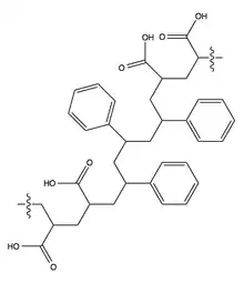 Binders promote the binding of pigment particles between themselves and the coating layer of the paper.[2] Binders are spherical particles less than 1 µm in diameterr. Common binders are styrene maleic anhydride copolymer or styrene-acrylate copolymer.[1] The surface chemical composition is differentiated by the adsorption of acrylic acid or an anionic surfactant, both of which are used for stabilization of the dispersion in water.[4] Co-binders, or thickeners, are generally water-soluble polymers that influence the paper's color viscosity, water retention, sizing, and gloss. Some common examples are carboxymethyl cellulose (CMC), cationic and anionic hydroxyethyl cellulose (EHEC), modified starch, and dextrin.