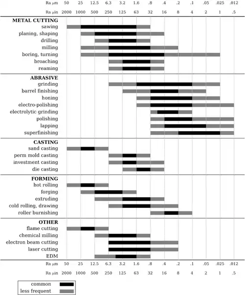 Just as different manufacturing processes produce parts at various tolerances, they are also capable of different roughnesses. Generally, these two characteristics are linked: manufacturing processes that are dimensionally precise create surfaces with low roughness. In other words, if a process can manufacture parts to a narrow dimensional tolerance, the parts will not be very rough.