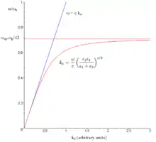 At low frequency, an SPP approaches a Sommerfeld-Zenneck wave, where the dispersion relation (relation between frequency and wavevector) is the same as in free space. At a higher frequency, the dispersion relation bends over and reaches an asymptotic limit called the "plasma frequency"[4] (see figure at right).[lower-alpha 1] For more details see surface plasmon polariton.