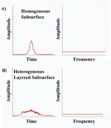 The usefulness of surface waves in determining subsurface elastic properties arises from the way in which they disperse. Dispersion (geology) is the way in which surface waves spread out as they travel across the surface of the earth. Basically, if ten waves travel along the surface of the earth at the same speed, there is no dispersion. If several of the waves start to travel faster than the others, dispersion is occurring. Surface waves of varying wavelengths penetrate to different depths (Figure 2) and travel at the velocity of the mediums they are travelling through. Figure 2 was generated by plotting the amplitude of surface waves against depth. This was done for two different wavelengths. Both waves have the same total energy, but the longer wavelength has its energy spread out over a larger interval. If earth materials’ elastic parameters yield higher velocities with depth, longer wavelength surface waves will travel faster than those with shorter wavelengths. The variation of velocities with wavelength makes it possible to infer critical information about the subsurface. Dobrin (1951)[3] uses a water disturbance example to illustrate the phenomenon that longer wavelengths tend to travel faster. This increase in speed with wavelength is seen for both group velocities and phase velocities. A wave group consists of waves at varying wavelengths and frequencies. Individual waves of a wave group are usually generated at the same time, but tend to spread out within the group because each wavelet travels at a different speed. A group velocity is basically the speed at which a wave group travels. A phase velocity is the speed at which an individual wave travels, having its own characteristic wavelength and frequency. Fourier theory tells us that a sharp impulse is made up of infinite frequency content in phase at one point. If each frequency travels at the same speed, that peak will remain intact. If each frequency travels at a different speed, that peak will spread out (Figure 3). This spreading out is dispersion. Phase and group velocity are both dependent on wavelength and are related by the equation