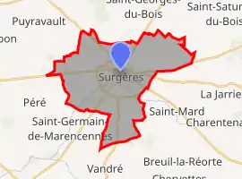 In 1850 Surgères absorbed part of the old commune of Saint-Pierre-de-Surgères, the other part being reattached to the neighbouring commune of Saint-Germain-de-Marencennes.