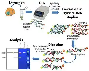 The DNA of interest is denatured and annealed in order to form heteroduplexes containing a mismatch at the point of the mutation, which can then be identified by the Surveyor nuclease. If the DNA is predicted to be homogenous (e.g. homoplasmic mitochondrial DNA or identical alleles on both chromosomes of genomic DNA) then DNA from a control sample is needed in order to form a heteroduplex which is then recognizable by the nuclease. If the DNA sample is heterogeneous, no additional control DNA is needed; however, the PCR products should still be denatured and annealed in order to create heteroduplexes.