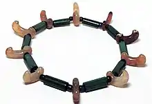 Amaterasu declares that the male deities were hers because they were born of her necklace, and that the three goddesses were Susanoo's.[19] Susanoo, announcing that he had won the trial,[lower-alpha 1] thus signifying the purity of his intentions, "raged with victory" and proceeded to wreak havoc by destroying his sister's rice fields, defecating in her palace and flaying the 'heavenly piebald horse' (天斑駒, ame-no-fuchikoma), which he then hurled at Amaterasu's loom, killing one of her weaving maidens.[20][21][22] A furious Amaterasu in response hid inside the Ama-no-Iwato ("Heavenly Rock Cave"), plunging heaven and earth into total darkness. The gods, led by Omoikane-no-Kami (思金神), eventually persuade her to come out of the cave, restoring light to the world.[23][24] As punishment for his misdeeds, Susanoo is thrown out of Takamagahara:[25][26]