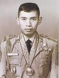 Yudhoyono had wanted to join the army since he was a child.[4] In school, he developed a reputation as an academic achiever, excelling in writing poems, short stories, and play-acting. Yudhoyono was also talented in music and sport, reflected when he and his friends established a volleyball club called Klub Rajawali and a band called Gaya Teruna.[5]