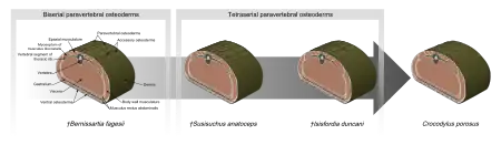 Susisuchus has a dorsal shield of osteoderms that is similar to those of the more derived clade Eusuchia, which includes living crocodilians. Susisuchus was one of the first mesoeucrocodylians to have a tetraserial paravertebral shield, which is formed from the dorsal osteoderms to make the back more rigid. In a tetraserial paravertebral shield, there are four separate rows of paravertebral osteoderms (osteoderms near the midline of the back). Earlier mesoeucrocodylians such as Bernissartia have biserial paravertebral shields, in which there are only two rows of paravertebral osteoderms. These two rows of large osteoderms became segmented into four smaller rows in Susisuchus.[3] Susisuchus also has two rows of accessory osteoderms to either side of the paravertebral osteoderms which are not part of the shield.[4]