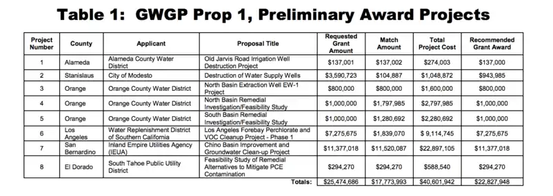 - "State Water Board Approves Proposition 1 Funding for Cleanup of Groundwater Contamination" (PDF). Retrieved 6 August 2017.