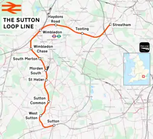 The Sutton Loop Line,[1] also known as the Wimbledon Loop,[2] is a railway line that diverges from the Portsmouth Line[1] at Streatham South junction and rejoins it near Sutton station. Trains leave southwards from Streatham to enter the loop and then return going northwards. The short section between West Sutton station and West junction is known as the "Wall of Death",[3] possibly due to the very steep concrete walls to the cutting on both sides and the sharpness of the curve which resemble the motorcycle ride at a funfair.