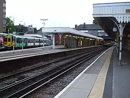 Platforms 1 and 2 can accommodate 12-coach trains, and were used by the express services to Bognor Regis and Portsmouth Harbour until they were diverted in the early 1980s to serve Gatwick Airport. Nowadays all trains calling at Sutton are formed of ten coaches or fewer. At the London end of platform 1, there are the remains of a fifth platform, which was a bay for local services via Mitcham Junction.