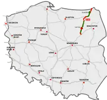 A strategic communication artery, known in the international E-road network as E67 or as Via Baltica (expressway S61 on the Polish side and A5 highway on the Lithuanian part), passes through the Suwałki Gap.[24] It is part of the North Sea-Baltic Corridor (previously the Baltic-Adriatic Corridor),[25] one of the core routes of the Trans-European Transport Network (TEN-T) that connects Finland and the Baltic states with the rest of Europe.[26] The Polish expressway is currently completed or under active construction (with the exception of a fragment of the Łomża bypass); the opening of most of the yet-unopened segments is expected by 2023,[27] and the road is planned to be finished by 2024.[28] On the Lithuanian side, the construction of A5 highway to the border is in early stages, with the design contracts awarded in 2020-2021. The section of the motorway close to the Suwałki Gap is expected to be completed by late 2025.[29]