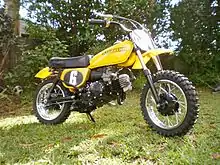 The Suzuki JR50 is a miniature motorcycle with a 49 cc (3.0 cu in) displacement and a single-speed automatic transmission, using a centrifugal clutch and height adjustable suspension. An oil injected two-stroke engine provides optimum lubrication and an oil level window makes it easy to see when a refill is needed. It is designed for children ages 5 to 12, and has been used for both racing and recreational riding. The JR50's engine was later used in the ALT50 and LT50 ATV's.