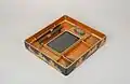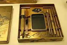 The first suzuri-bako were developed in 9th century Japan.[2] At the time, calligraphy was an integral part of Japanese society. In order for a writer to produce a high-quality calligraphy script, a set of precise tools was needed. The most important of these tools was the inkstone, which was required to hold and transfer ink onto a writer's brush.[2] Ink sticks, water droppers, and a small knife were also part of a calligrapher's set.[2] Suzuri-bako were designed to ensure that the various tools a calligrapher needed were properly organized and protected.[1] Due to the insoluble nature of resin-based lacquer, the contents of the writing box were relatively safe from moisture.[3] Inside of the square or rectangular boxes rested a number of different trays and holders, the layout of which differed from period to period.[2] Early boxes were large enough to accommodate both the writer's implements and papers, while later boxes only housed tools. A second type of box, the ryōshibako, were used in later periods to house completed papers.[2]