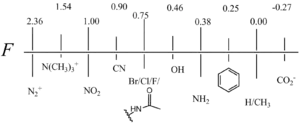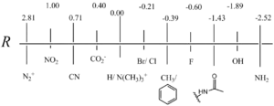 where i is an intercept to keep from fixing the origin at (0,0). If this was not done, the equation would give exceedingly more weight to the unsubstituted compounds that one is trying to make a comparison to using this equation.[1] A linear least-squares analysis is used to determine the coefficients/constants a, b, and i (Swain and Lupton used a procedure called DOVE: Dual Obligate Vector Evaluation).[2] Constants were first based on three previous reactions (σm, σp, σp+), which leads to more possible errors since the compiled data is only a minimal combination of a much larger pool. Seeing possible error in this limited pool, the data pool was increased by assigning a scale to begin with. A zero-scale is used for hydrogen, because it is known to neither readily donate or accept electron density when attached to a carbon atom due to similar electronegativities. A value of 1 was assigned to NO2, because previous research determined the effect of this substituent was predominantly due to resonance.[3] Lastly, F was set equal to R for both components so that the field effects could be compared directly to the resonance effects. This then leads to: