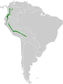 The swallow-tailed nightjar is a bird of the Andes. The nominate subspecies is found in Colombia and Ecuador and U. s. kalinowskii in Peru and Bolivia. In Colombia it is found in the Central and Eastern Andes, on the main Andes' west slope in northern Ecuador and northwestern Peru, and on the east slope for the entire length of Ecuador, most of Peru, and well into Bolivia. In Colombia it ranges from 2,500 to 3,500 m (8,200 to 11,500 ft) of elevation, in Peru from 2,000 to 3,600 m (6,600 to 11,800 ft), and in Bolivia from 2,000 to 3,400 m (6,600 to 11,200 ft). In Ecuador it is mostly found from 2,500 to 3,200 m (8,200 to 10,500 ft) but also as low as 2,100 m (6,900 ft) in Napo Province. The swallow-tailed nightjar typically inhabits elfin forest but also the edges of humid montane forest and openings with bamboo, grass, or shrubs.[6]