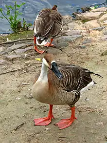 The swan goose (Anser cygnoides) is a large goose with a natural breeding range in inland Mongolia, northernmost China, and the Russian Far East. It is migratory and winters mainly in central and eastern China. Vagrant birds are encountered in Japan and Korea (where it used to winter in numbers when it was more common), and more rarely in Kazakhstan, Laos, coastal Siberia, Taiwan, Thailand and Uzbekistan.[2][3]