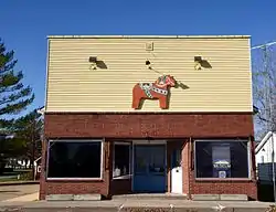 The three historic buildings housed commercial businesses beginning in an era when this unincorporated community was a settlement of Swedish immigrants. It is not known when the first retail establishment was built here, by the Berg Hardware Store, the frame building furthest to the west, was constructed in 1875. The Sam White General Store, the middle frame building, was completed in 1881. Both of these buildings were moved to their present location when the Farmers Union Exchange was built in 1928. This building type, a frame structure with the "boomtown" front, was typical of frontier towns and were replaced by brick buildings as the town grew. However, in many small towns in Iowa, this style continued to be the norm.[2] The brick veneer and the aluminum siding above it were added to the front of the building in 1964.