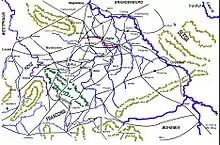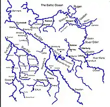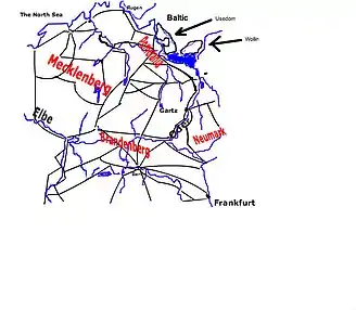 Meanwhile, stationed at Pasua and Elbing (to the far east), Oxenstierna was seeking to move towards the king. The cities that were critical to establishing a land route between the two armies was Kolberg (occupied by the Imperialists) and Cammin. Knyphausen and Oxenstierna were entrusted with the task of establishing a land route between Prussia and Swedish occupied Pomerania.[61] Meanwhile, being August as it was, the king was contemplating the establishment of winter quarters.[61] However, the Administrator of Magdeburg, Christian William declared in favor of the Swedish, drove out the Imperial garrison and called the Swedes to aid the city. This was done without the king's prior knowledge, and there were many objects which the king deemed to be of higher importance than the city of Magdeburg. It is not likely the king would have encouraged such a move if he had been consulted about it. The king still wanted to march to the Elbe,[61] take possession of the duchy Mecklenburg and engage in negotiations with Hamburg and Lübeck. Magdeburg was much too far away, and there were large contingents of Imperial troops between the Swedish army and Magdeburg. However, the king sent a colonel, Dietrich von Falkenberg, to the city and ordered him to bring the city into the highest level of defense for an anticipated siege by the Imperials.[62]