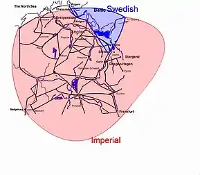 Ueckermünde and Barth (to the west of Stralsund) were also taken without incident.[58] Wolgast was besieged, and although the garrison gave up the city to the Swedes they held out in the citadel of the city.[58] This garrison hung onto the citadel until the 16th of August.[58] Treptow[57] was also taken.