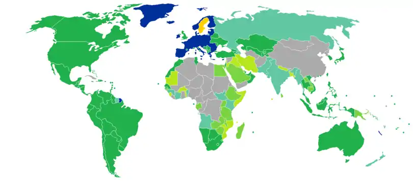Because Sweden forms part of the European Union, Swedish citizens are also citizens of the European Union under European Union law and thus enjoy rights of free movement and have the right to vote in elections for the European Parliament.[9] When in a non-EU country where there is no Swedish embassy, Swedish citizens have the right to get consular protection from the embassy of any other EU country present in that country.[10][11] Swedish citizens can live and work in any country within the EU as a result of the right of free movement and residence granted in Article 21 of the EU Treaty.[12]