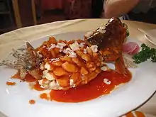A speciality of Shandong province, in particular the city of Jinan,[12] the Yellow River carp is prepared by making diagonal slices partway through its flesh. It is next coated in corn flour then deep fried causing the fish to curl and the slices to open out. Finally a sweet and sour sauce is poured over the cooked fish. This is one of the distinctive dishes typical of Lu Cuisine.