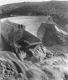 A total of 20,507 cubic yards (15,679 m3) of material were used in the construction of the dam, including 17,562 barrels of cement. The total cost came to $234,074.11, including preliminary investigations and purchase of the land to be flooded by the reservoir.[14] The dedication ceremony was on April 19, and over three thousand people came to watch. At that time, the dam was the highest masonry arch dam in the United States and was considered an engineering marvel and tourist attraction.[15]
