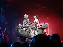 "Swine" was later added to the setlist for the whole duration of Gaga's tour, ArtRave: The Artpop Ball, where it was performed as the last song before the encore ("Gypsy"). For the performance, Gaga was dressed as a rave-girl, which was called "a spin on the anime schoolgirl trope".[39] She was wearing multicoloured dreadlocks and fluorescent furry boots.[39] On some occasions, Gaga invited audience members on stage to "rave alongside her".[40] James Duffield from MTV called the performance "a sensory overload – the confetti cannons are back, strobe lights and dancers with pig masks start spewing fake blood from their mouths".[41]