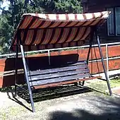 Canopy swings are similar to porch swings, but they are hung on a separate frame and are usually portable. The name is derived from a canopy installed as a sunshade.