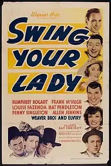 Swing Your Lady is a 1938 country musical comedy film directed by Ray Enright, starring Humphrey Bogart, Frank McHugh, and Louise Fazenda. Also featured in the cast is Ronald Reagan in one of his early roles.