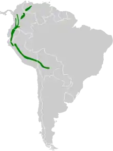 The sword-billed hummingbird is found in the Andes from western Venezuela through Colombia, Ecuador, and Peru to Bolivia.[14] It inhabits humid and wet montane forest, forest edges, shrubland, gardens, and patches of páramo at elevations of 1,700–3,500 m (5,600–11,500 ft), but is most common at elevations of 2,400–3,100 m (7,900–10,200 ft). The species is generally non-migratory, but shows localized movements in Colombia and northwestern Venezuela, where it moves to higher altitudes in the early wet season and returns to lower elevations in the dry season.[10][11]