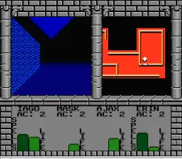 Gameplay is simple. The player navigates through a crude representation of a dungeon, presented in split-screen format which allows the player to simultaneously view the dungeon from a first-person perspective and a simple map of the current level showing the party's location. Encounters with monsters occur randomly (and occasionally in specific locations), during which the map is replaced by gauges representing the creatures' health. During the turn-based fights, the player controls the characters' actions to attack, cast magic spells, or flee. Pressing A causes a character to launch a general physical attack, but by holding a direction on the D-Pad while pressing A, the player(s) can attack a certain part of the enemy's body to possibly cause greater damage. The entire game takes place in an underground dungeon composed of 16 levels, with the serpent at the end.