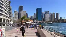 The Tank Stream is encased in a concrete drain beneath the streets of the central business district[9] and all native bushland has been cleared. The head of the cove is occupied by the Circular Quay ferry terminal. On Bennelong Point at the northern end of the eastern shore of the cove stands the Sydney Opera House. On the western shore is the historic district known as The Rocks.[10]
