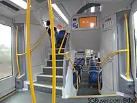 Carriage interiors were designed by Transport Design International.[9] The inside of the train includes additional Emergency Help Points and CCTV cameras compared to older classes. Improvements to the DVAs (Digital Voice Announcements) with differential pitch of the voice allow more natural sounding speech. 'Smart' air-conditioning automatically adjusts to the outside temperature and the number of passengers on board.[10] Accessibility features include 16 wheelchair spaces, portable wheelchair ramps in the end cars, red fabric on priority seating and additional handrails compared to older trains in the fleet.[8]