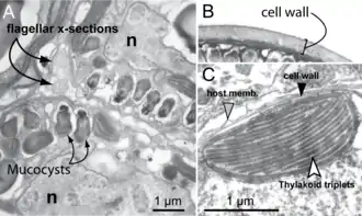 The coccoid cell is surrounded by a cellulosic, usually smooth cell wall that contains large-molecular-weight proteins and glycoproteins.[38][71] Cell walls grow thicker in culture than in hospite.[7] The cell membrane (plasmalemma) is located beneath the cell wall, yet little is known about its composition and function in terms of the regulation of trans-membrane transport of metabolites. During karyokinesis and cytokinesis, the cell wall remains intact until the mastigotes escape the mother cell. In culture, the discarded walls accumulate at the bottom of the culture vessel. It is not known what becomes of the walls from divided cells in hospite.[72] One species, S. pilosum, possesses tufts of hair-like projections from the cell wall; this is the only known surface characteristic used to diagnose a species in the genus.
