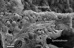 Many Symbiodinium species are known primarily for their role as mutualistic endosymbionts. In hosts, they usually occur in high densities, ranging from hundreds of thousands to millions per square centimeter.[4] The successful culturing of swimming gymnodinioid cells from coral led to the discovery that "zooxanthellae" were actually dinoflagellates.[5][6] Each Symbiodinium cell is coccoid in hospite (living in a host cell) and surrounded by a membrane that originates from the host cell plasmalemma during phagocytosis. This membrane probably undergoes some modification to its protein content, which functions to limit or prevent phago-lysosome fusion.[7][8][9] The vacuole structure containing the symbiont is therefore termed the symbiosome. A single symbiont cell occupies each symbiosome. It is unclear how this membrane expands to accommodate a dividing symbiont cell. Under normal conditions, symbiont and host cells exchange organic and inorganic molecules that enable the growth and proliferation of both partners.