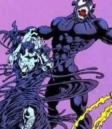 During the Kree-Skrull War, the Kree wanted to replicate the Skrull's shapeshifting abilities; they acquired a newborn symbiote which had been outcast from its species on the planet where Knull had created them.[13] They recruited Tel-Kar to be bonded to the young symbiote, and modified both Tel-Kar and the symbiote so that he could have full control over it. He infiltrated the Skrulls using the symbiote's shapeshifting ability, but was discovered. He deleted the symbiote's memories and separated himself from it.[14] The symbiote then reunited with the parasitic symbiotes, retaining little memory of its first host. When the corrupted symbiotes found out that this symbiote wanted to commit to its host rather than exploit it as they tended to do, they decided that it was insane and trapped it in a canister to be condemned to die on a planet that would later become part of Beyonder's Battleworld. There, it would be encountered by Spider-Man in the 1984 miniseries Secret Wars. In that story, which saw the heroes of Earth transported to this planet to battle their archenemies,[15] Spider-Man sought to repair or replace his tattered costume, which had been damaged in battle, and was directed by Thor and Hulk to a device inside the alien compound that they had come to use as headquarters. Mistaking the device in which the symbiote was imprisoned for the device Thor and Hulk mentioned, Spider-Man activated it, freeing the symbiote, which appeared before him as a black sphere that enveloped his body and took on the form of a black version of his costume that could respond to his mental commands. Spider-Man assumed that the device produced clothing designed to do this.[16] He did not know that Deadpool had already briefly bonded with the symbiote and had corrupted it with his unstable personality.[17] Spider-Man returned to Earth with the symbiote, where, after discovering that it was an alien lifeform that wanted to bond with him, he managed to separate himself from it by using sound waves to hurt the creature, which took refuge in a church's bell tower. It later bonded with Eddie Brock, who went to the church, despondent and vengeful after his journalism career was destroyed because he incorrectly identified the serial killer known as Sin-Eater as a man who later turned out to be a compulsive confessor; he blamed this turn of events on Spider-Man. Having bonded with the symbiote, the two became the being known as Venom.[18] During this time, it spawned seven offspring and a clone; its first child later had three of its own, producing the symbiotes known as Carnage, Scream, Lasher, Phage, Agony, and Riot.