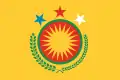 A number of different symbols have been used to represent the Autonomous Administration of North and East Syria (NES), commonly known as Rojava. The Autonomous Administration adopted an official emblem in December 2018. The emblem consists of the words "Autonomous Administration" in Arabic, surrounded by seven red stars representing the regions of northeast Syria, as well as a branch of olives and spike of wheat, two crops grown in the region. Surrounding all of the symbols is the words "Autonomous Administration of North and East Syria" written in Arabic, Kurmanji, Syriac, and Turkish, the languages spoken in the region. The blue and yellow semicircles the whole emblem is put upon represents the Euphrates river and the "permanent spring" of the region.[1] A flag with the Autonomous Administration's emblem on a white field is also used occasionally to represent the Administration itself.[2][3]