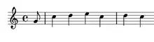 The Alleluia motif dominates the first movement. It is the first theme; the second theme is also derived from it and it is also included in the closing material of the exposition. In the development, after the first theme is restated, the first three notes of the motif (do-re-mi) are repeated seven times at different pitch levels against sixteenth-note accompaniment.[5]